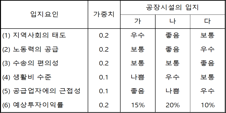 | 1) | 여러 가지 입지요인들을 파악하여 요인별로 가중치를 부여한 다음 입지 후보 | ||