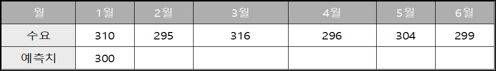 | (2) 2월부터 6월까지의 수요를 단순지수평활법으로 예측하여 다음 표를 완성 | |||