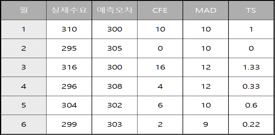 | (TS:Tracking Signal)을 사용한다. 실제수요와 예측치가 아래 표와 같을 때 | |||