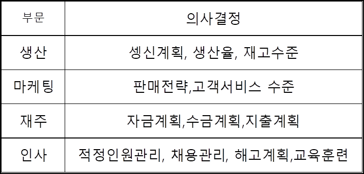| (1) 공장관리에서 수요예측을 기반으로 하는 생산, 마케팅, 재무, 인사부문에서 행하는 중요 | ||