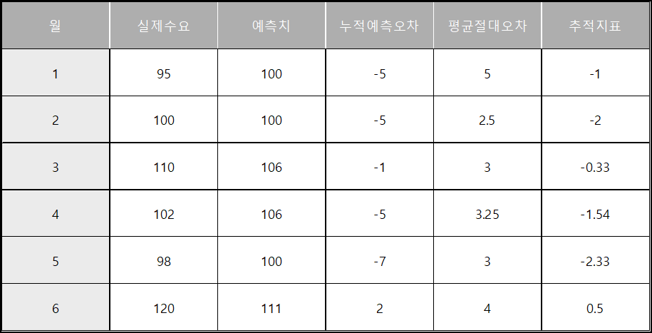 | 전체 예측기간 동안 실제수요와 예측수요 간의 차이, 즉 예측오차를 누적한 | |||