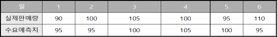 | (TS:Tracking Signal)을 사용한다. 실제수요와 예측치가 아래 표와 같을 때 | |||