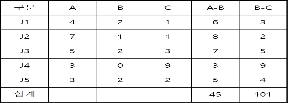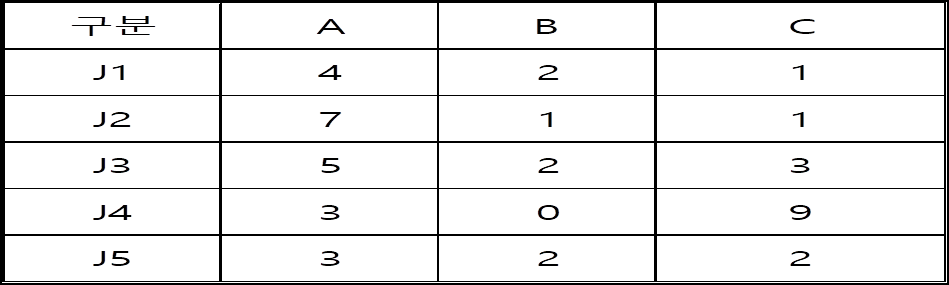 | 문) | A, B, C 3대의 기계를 거쳐야 하는 5개 작업(J1~J5)의 기계별 가공시간이 다음 | ||