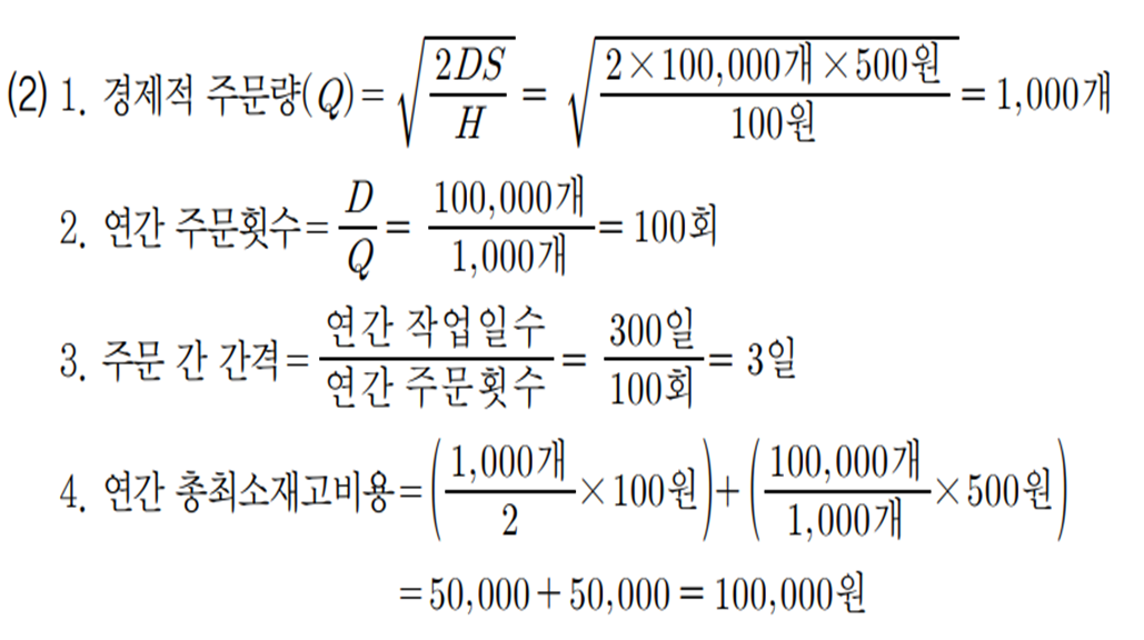 (2) 어떤 제품의 연간 수요량은 100,000단위, 연간 재고유지비용은 단위당 100원이며 매회