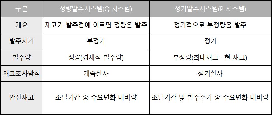 | 형(Q system)에서는 부정기적으로 정량(定量)을 발주하는 데 반해서 정기발주 | |||