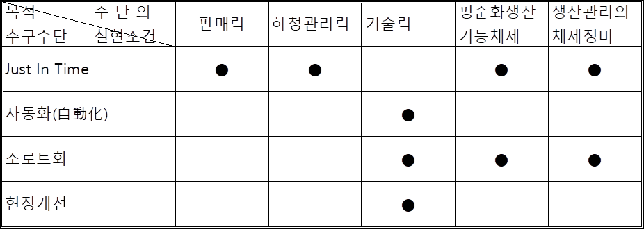 | 1) | 도요타 생산방식의 수단, 즉 하위시스템(JIT, 소로트화, 자동화, TQC 및 현장 | ||