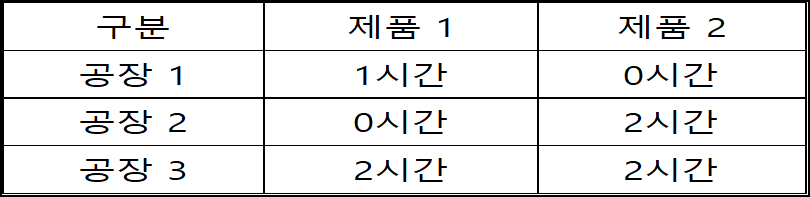 | 은 각각 6, 14, 18(시간/주)이다. 제품당 필요한 가공시간은 아래와 같고 가공 | |||