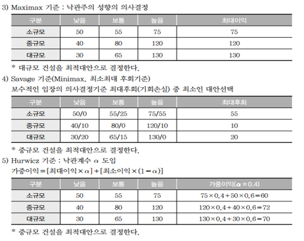 | 다음은 이를 바탕으로 의사결정모형의 구성요소인 대안과 상황을 정리한 것이다. | |