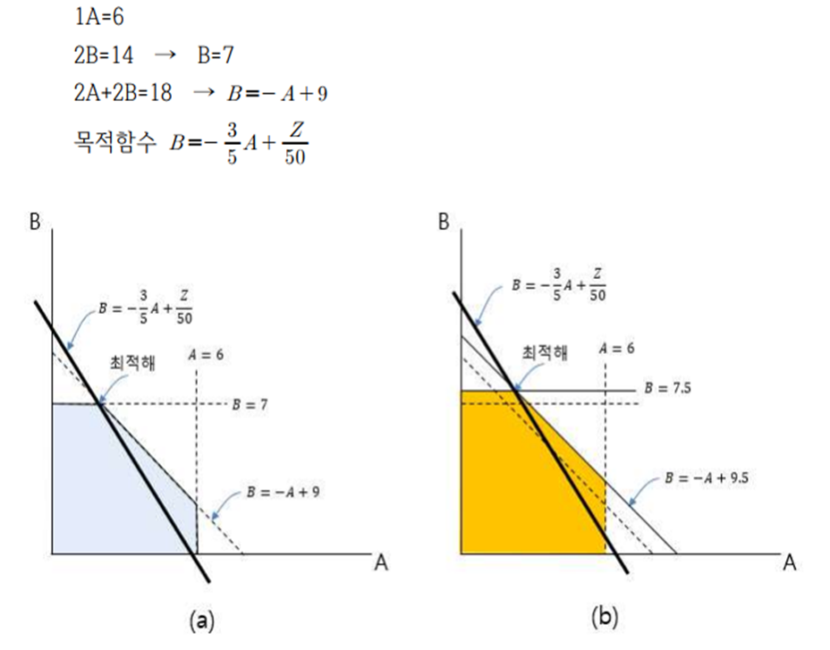| 최적해 A=2(개), B=7.5(개), Z=60+375=435(만원) | |||