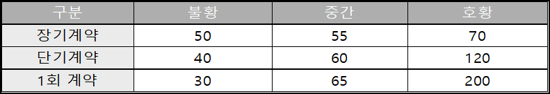 | 경우, 시장성이 좋을 확률과 나쁠 확률은 각각 50%이다. | |