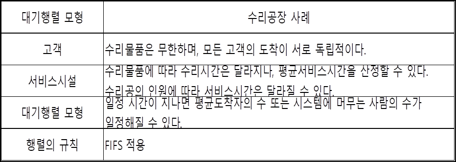 | (1) 대기행렬모형을 수리적으로 모형화하는 데 필요한 정보 4가지를 수리공장 | |||