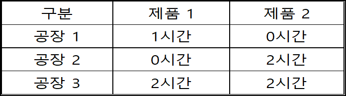 | 문) | 부품 회사는 2개 제품을 생산하기 위하여 공장1, 공장2, 공장3에서 주어진 | ||