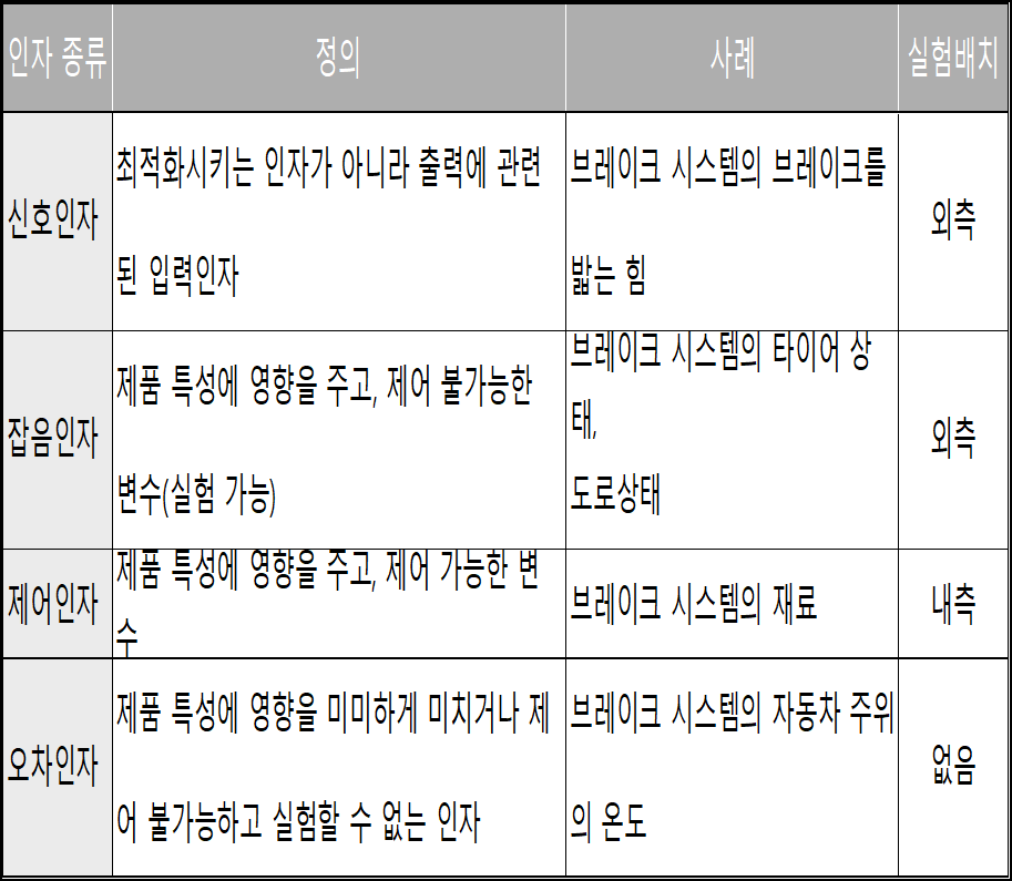 파라미터란 제품의 기능 특성치에 영향을 주는 제어 가능한 인자를 말한다.