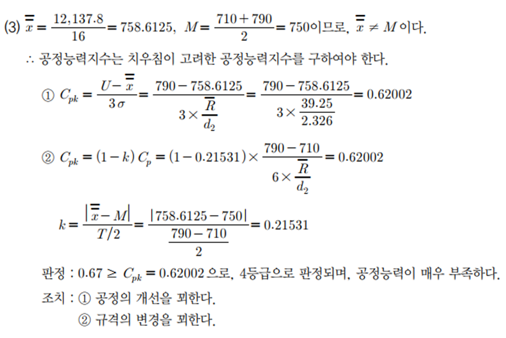| (3) 공정능력지수(Cp(PCI)를 구하여 판정하고, 개선방안을 제시하시오. |