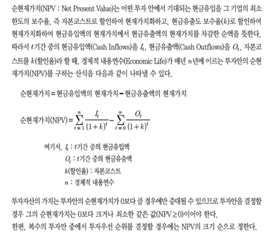 순현재가치(NPV)=현금 유입액의 현재가치-현금 유출액의 현재가치
