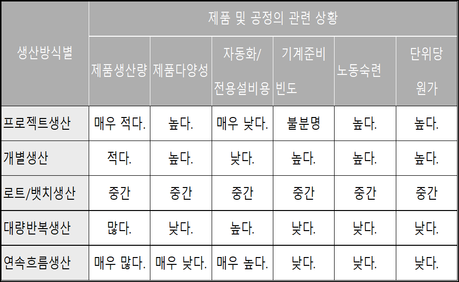 | 4. | 대량반복생산:대량의 동일 제품을 반복 생산하는 방식으로 자동차, 전자제품 | ||