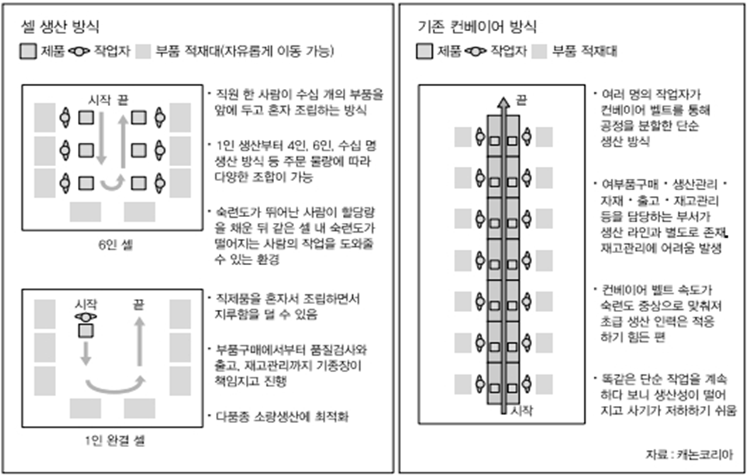 | 국내에서는 캐논코리아가 셀 생산방식을 기종장 제도로 도입한 후에 생산성 | |||