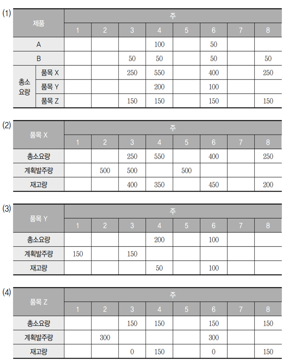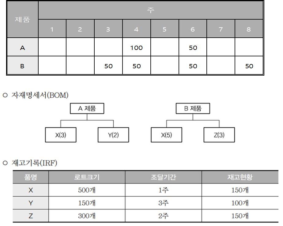 | 다음은 A 제품과 B 제품의 주생산계획(MPS:Master Production Schedule), 자재명세서 |