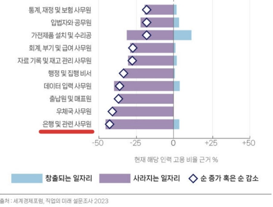 특히, 은행관련 사무원, 데이터 관련 사무원, 회계 부기 사무원 등이 사라지고 있어요.